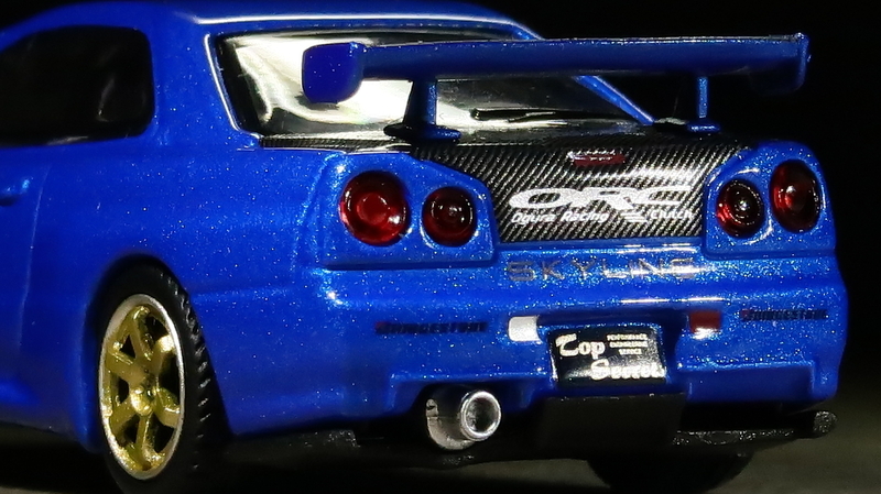 15シルビアと共にトップシークレットエアロをまとった34Rが登場しました。ベイサイドブルーを基調にフルエアロ化、当初純正と揃って金型が出ていたところ長らく動きの無かった社外チューンの34Rミニカーでしたが、とうとう念願の実現となったのです。