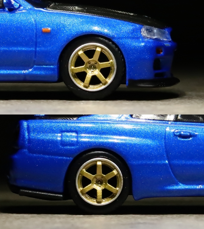 別パーツのヘッドライトは標準装備として、オレンジのウインカーを塗分けし、そのうち片方のみエアダクトの入った非対称のデザインが特徴的なフロントマスクを再現。インタークーラーの彩色もされながら、エアロミラーにカーボンボンネット、リップスポラーとフロント側も惜しみない社外パーツの充実ぶりがその再現性を語っています。