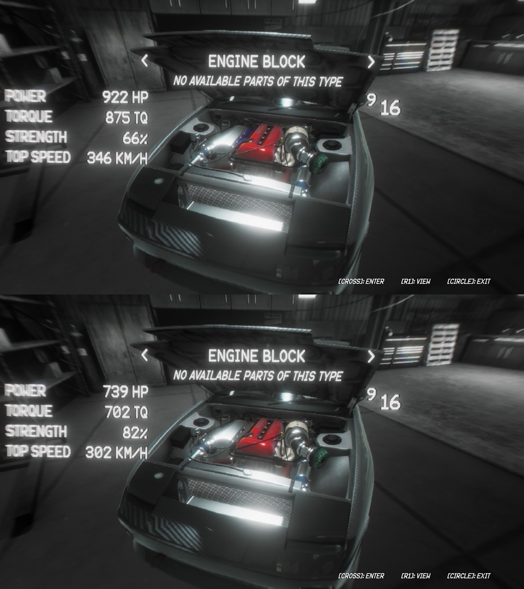 フルチと700馬力辺りにデチューンした状態でPAを訪れるとこれだけ馬力に違いが。基本的にCOMのスペックはプレイヤーのマシンスペックに連動することが写真を見ると分かるかと思います。