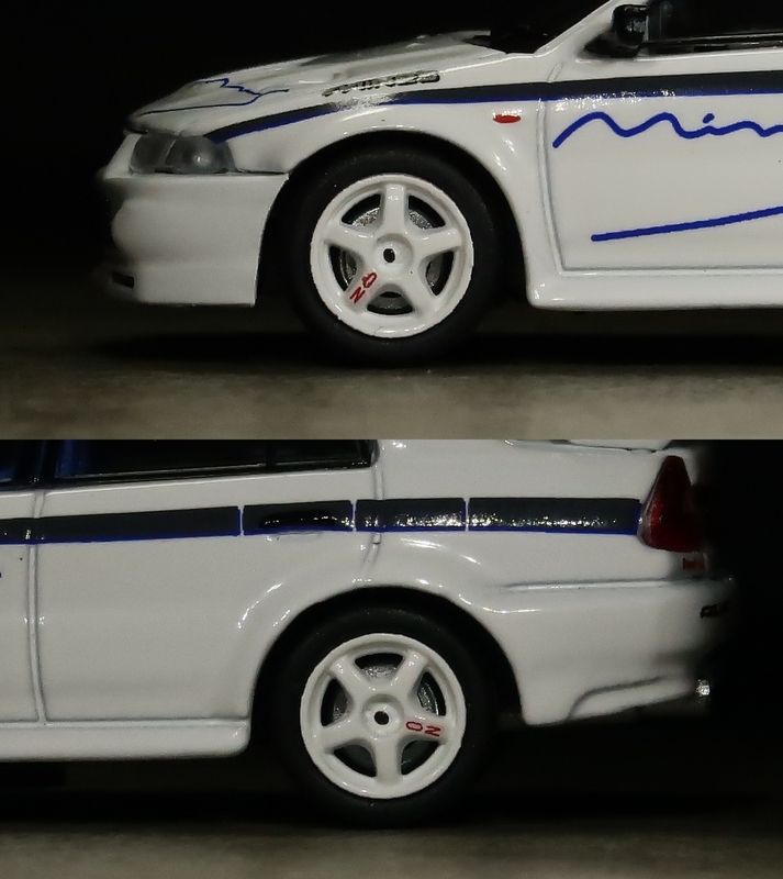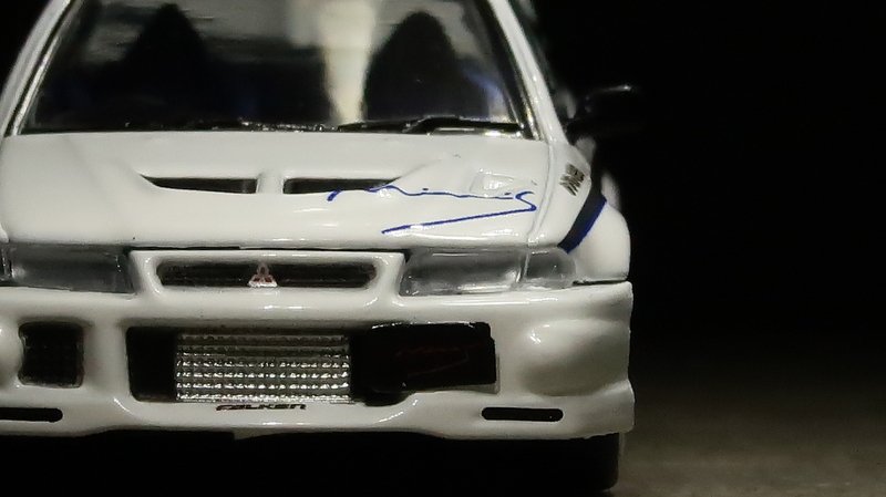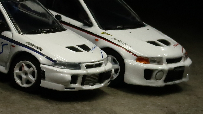 現在64スケール事情に至る大きな起爆剤ともなったであろうエボVのマインズ仕様と。エボVのモデルはラリーカーのテール流用のままでしたが、改めて見てもキメの細かさでいけばまだまだ引けは取りません。埋め込まれたフォグカバーの縁取りやメタルデカール時代のスリーダイヤエンブレム、エアロミラーなどがそれを証明しています。
