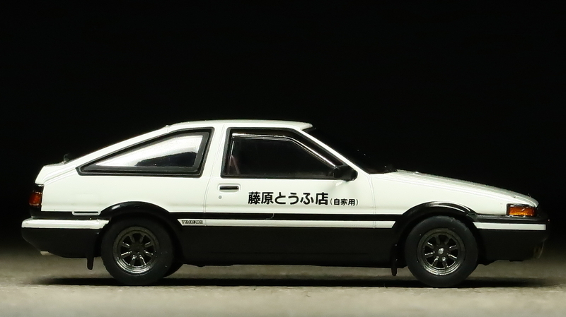 そんな復活の1台に列を並べたのは、頭文字Dの藤原とうふ店仕様ハチロクトレノ。筆者が手にしたのは初期バージョンの方で、プロD最終仕様のカーボンボンネットやロールバーなどが着いたのも同時発売。