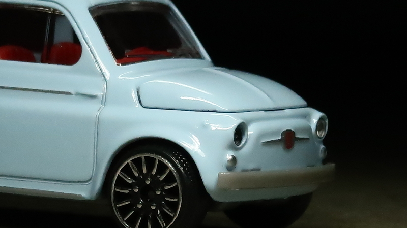 フロントには小さくもクリアパーツをヘッドライト部分に埋め込み、フィアットロゴをグリル中央にプリント。こちらもメッキバンパー部分は別に組み込まれ、更に片側ミラーも再現。